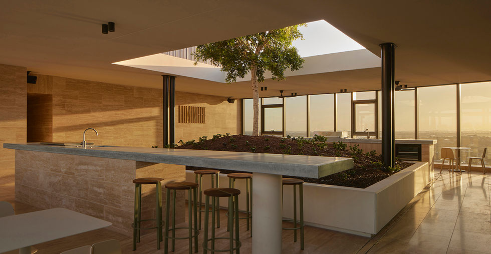 Luminare’s diamond-sculpted facade, adorned with deep bronze luminous glass and curved ribbon concrete cantilevers makes Luminare a distinct and ever-changing landmark. By day, the building reflects varying luminosity, while at night, it transforms into a mesmerizing lantern, adding a touch of enchantment to the surroundings.